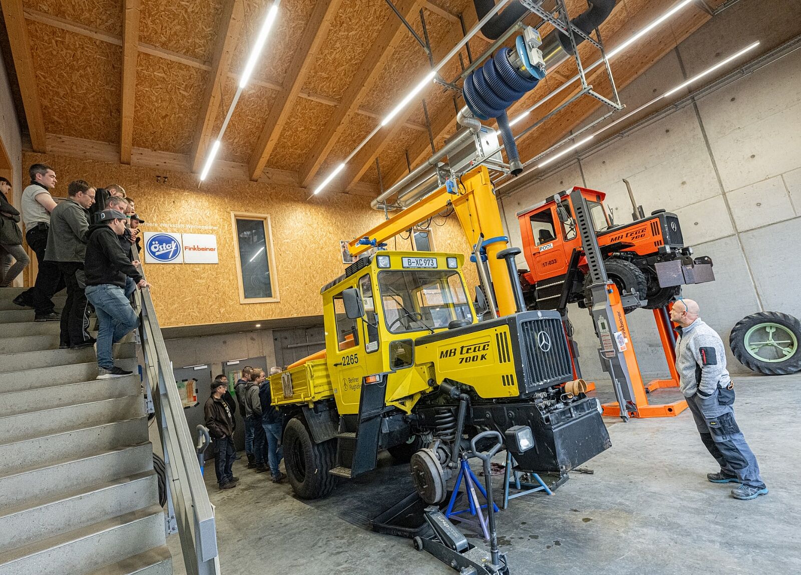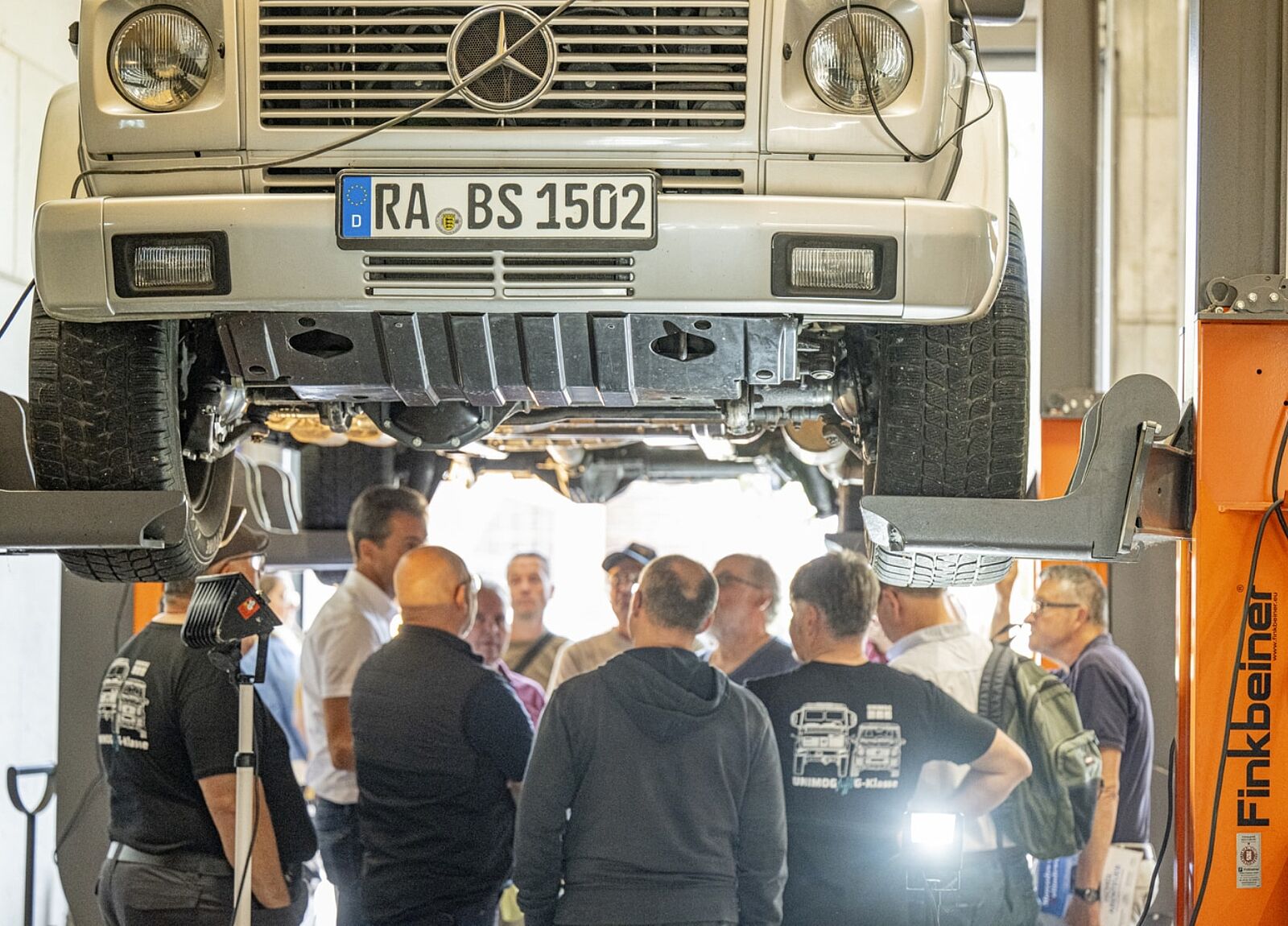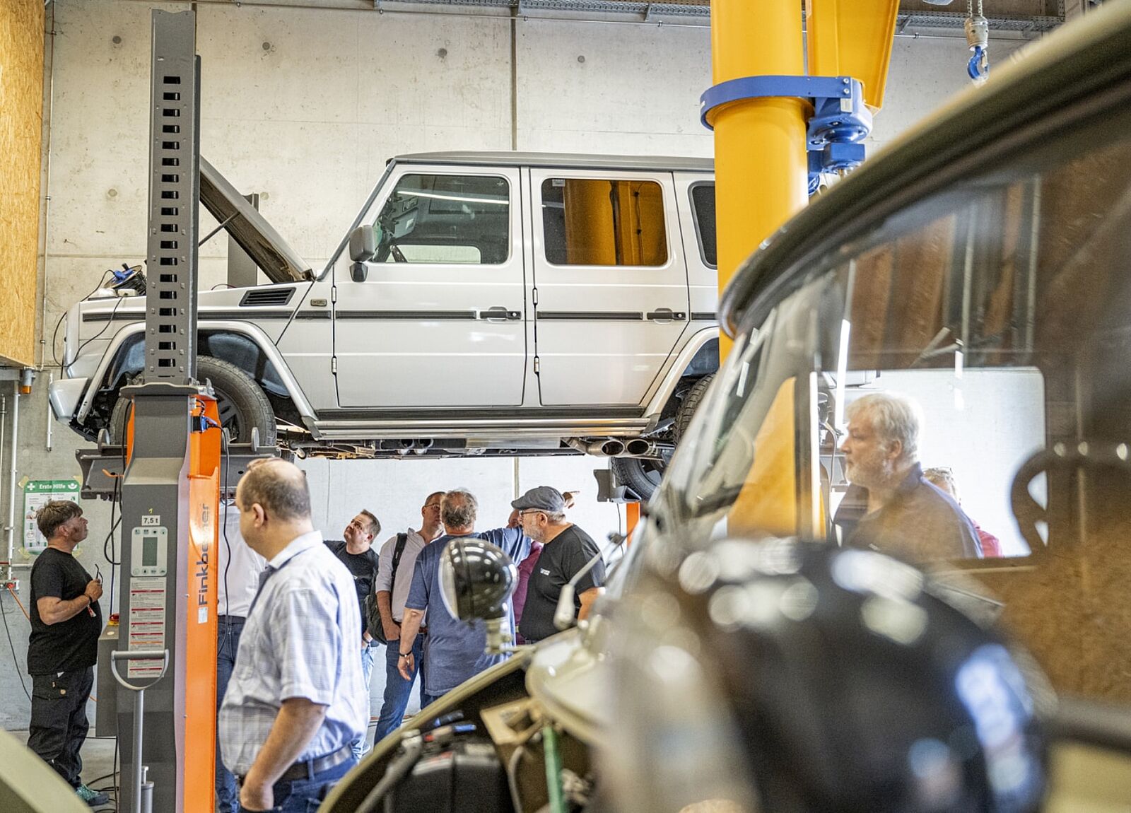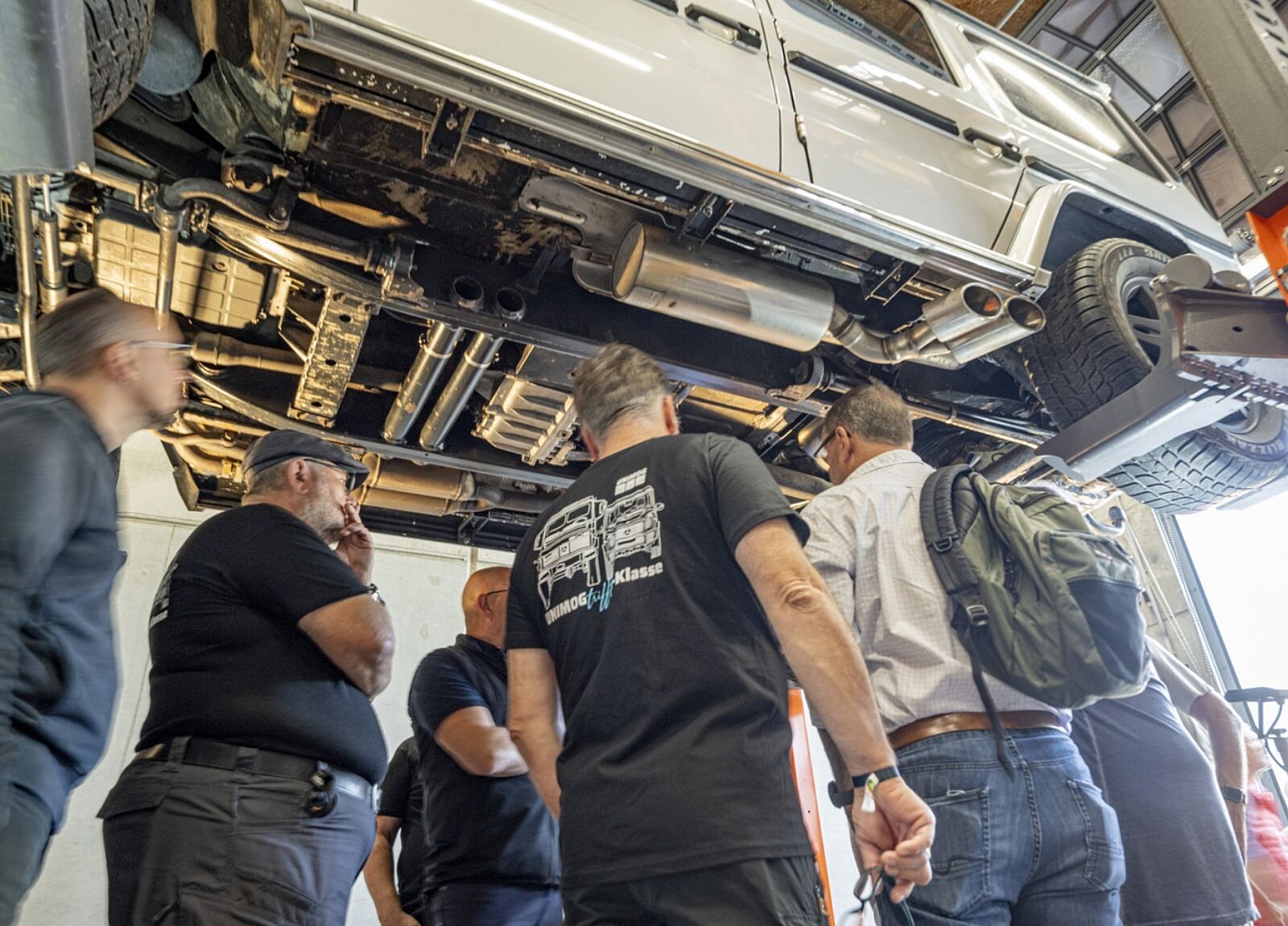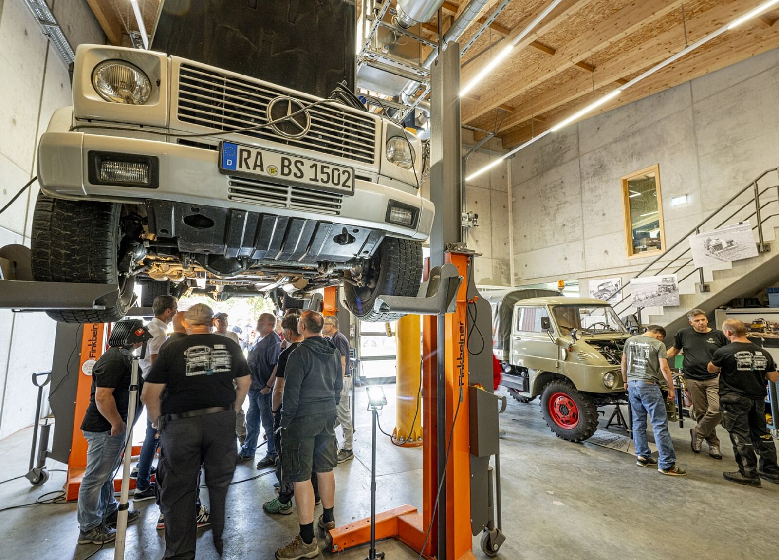 Darüber hinaus können in unseren Werkstattkursen Interessierte einen Blick unter die Haube werfen. Neben Unimog aus unterschiedlichen Jahrzehnten kommen aber auch MB-trac und sogar G-Klassen auf die Hebebühne.